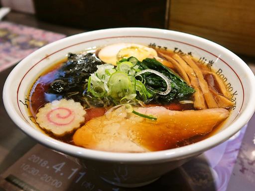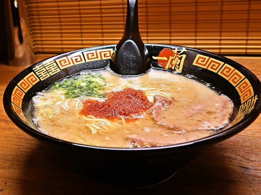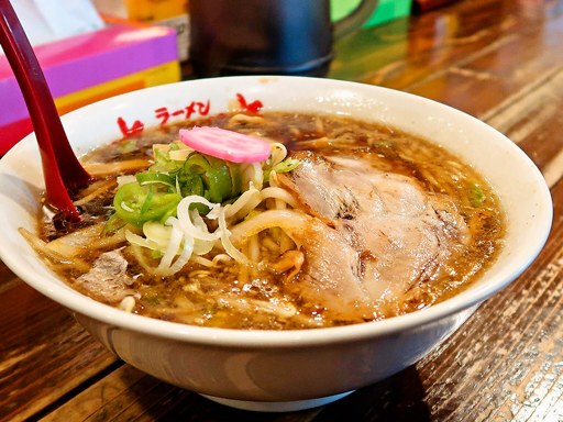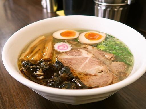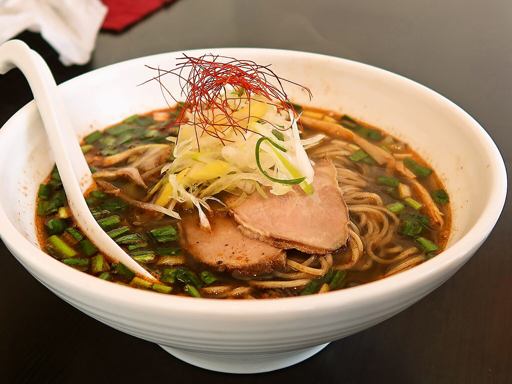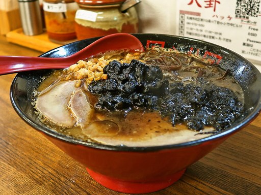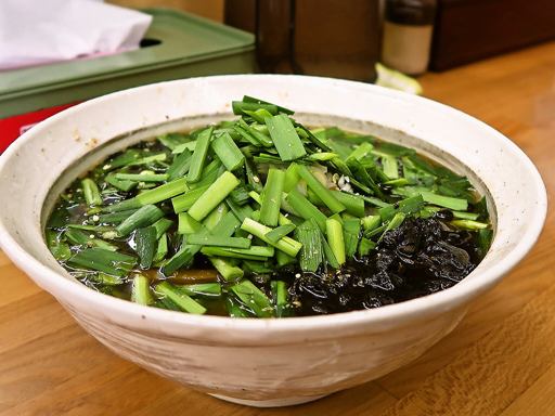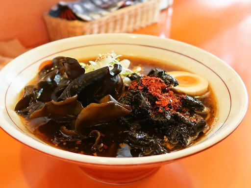 黒色の深い醤油味ありつつ、実は円く優しい味わいのスープに、激辛ホルモンの辛味馴染ませる一品!