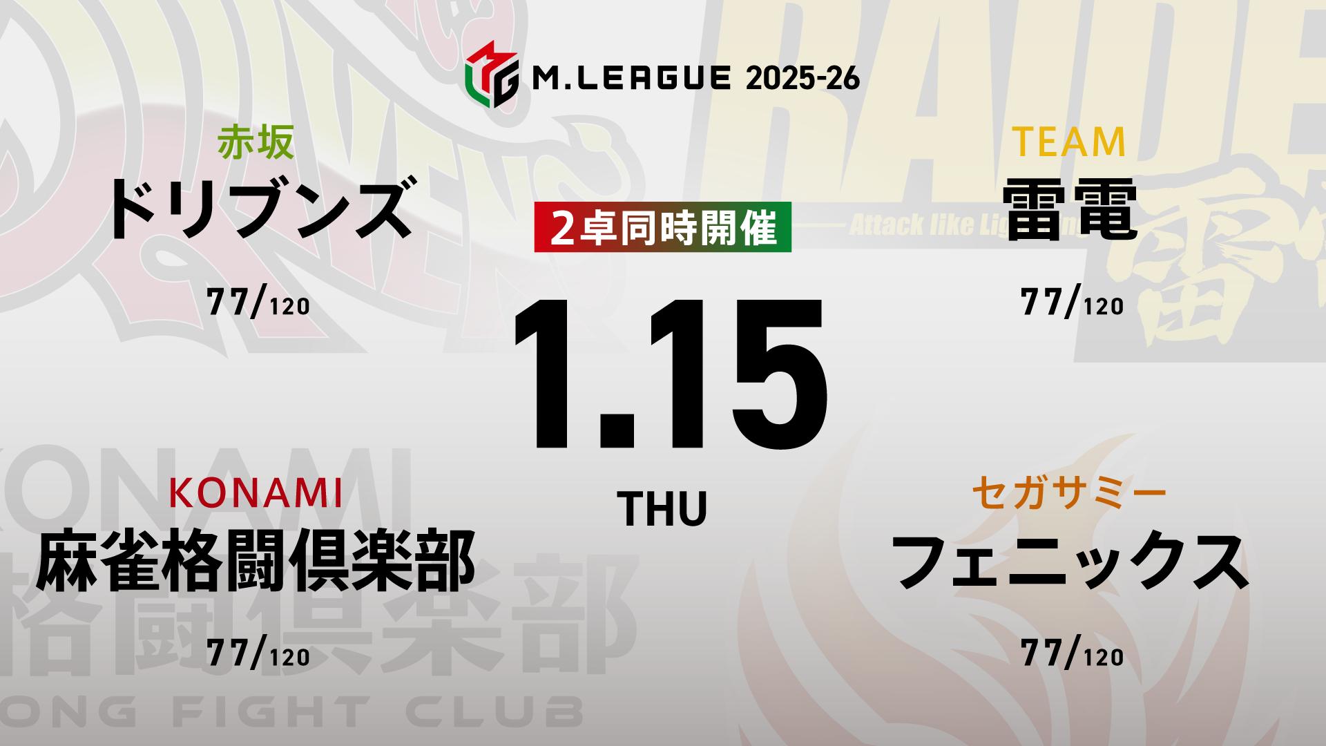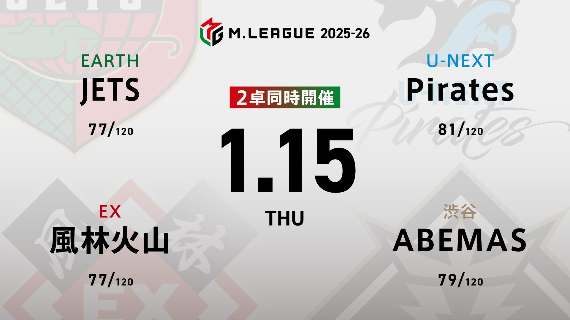 EARTH JETSvsEX風林火山vs渋谷ABEMASvsU-NEXT Pirates | 「この熱狂を外へ」数多の麻雀プレイヤー達の中から、ほんの一握りのトッププロだけが出場できるナショナルリーグ。優勝賞金7000万円とチームの威信をかけて知を競い合い、優勝シャーレの栄光を目指して戦う。Mリーグ2025-26では、新たに「EARTH JETS(アースジェッツ)」がチームに加わり、新Mリーガー7名、10チーム総勢40名でのシーズンとなる。