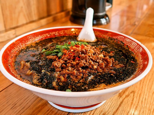 黒色の深い醤油味ありつつ、実は円く優しい味わいのスープに、激辛ホルモンの辛味馴染ませる一品!