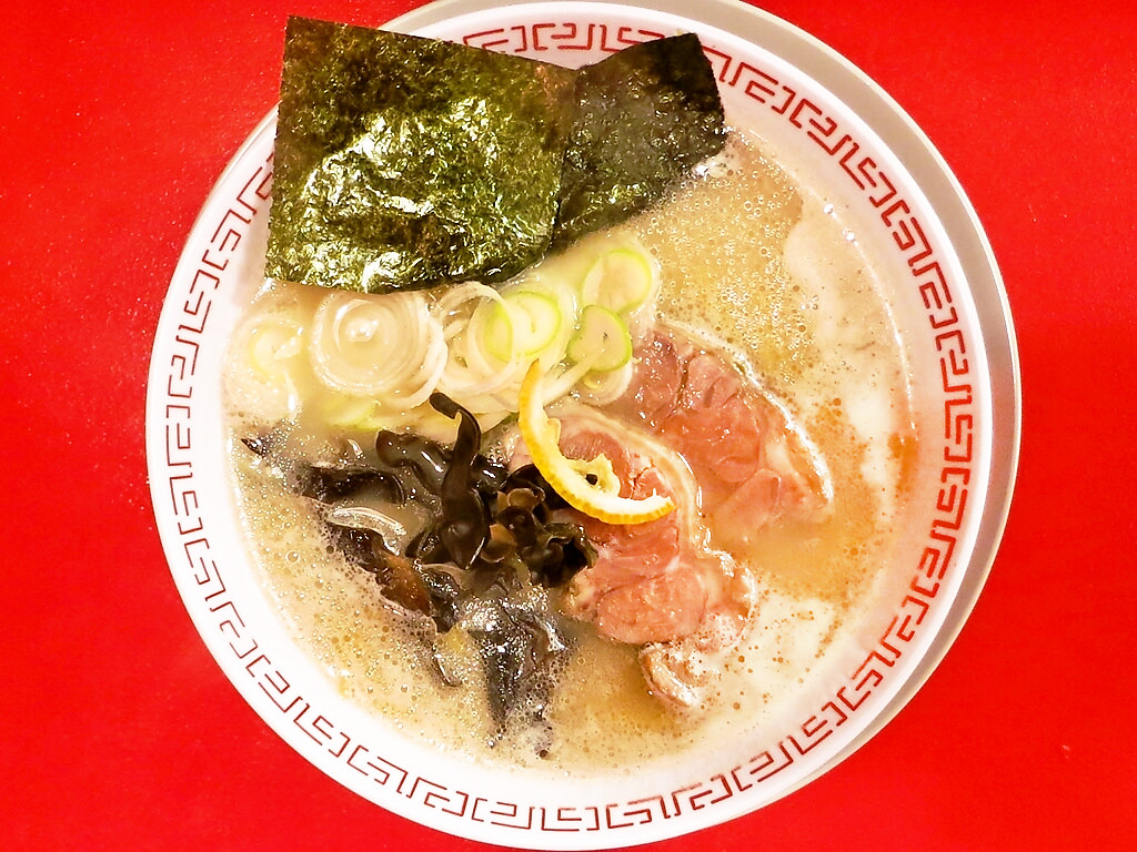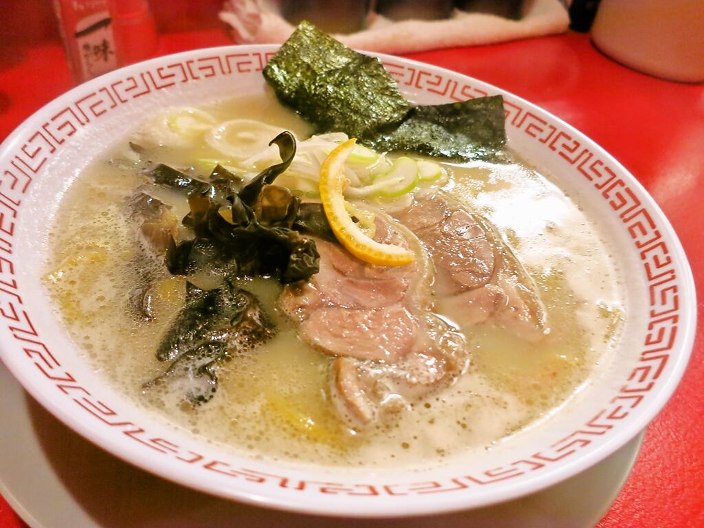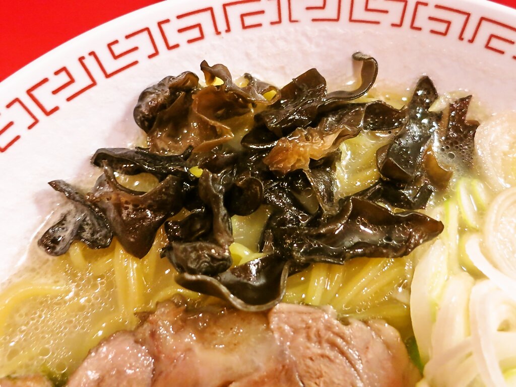 具材は、薄めのキクラゲ、海苔、白ねぎ、スダチ?、チャーシュー。