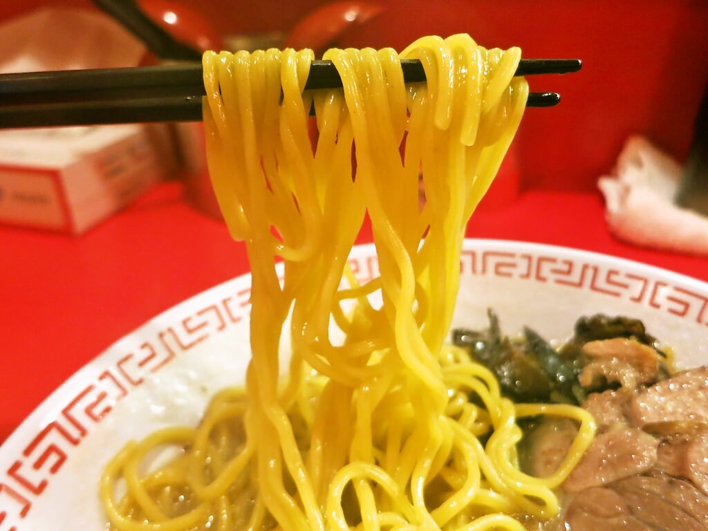 丸型の中細麺で、小麦粉の纏まりのある食感に、程よく油を纏って、