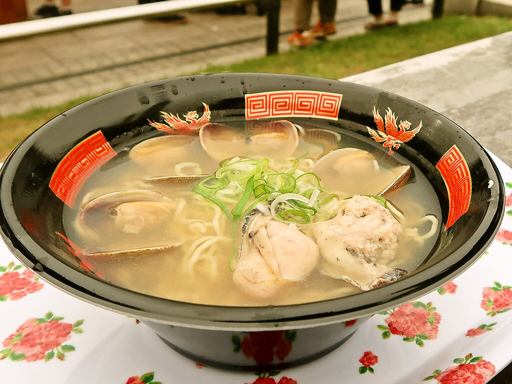 牡蠣とあさりがトッピングされた、出汁味広がる、見た目通りのあっさり寄りなスープ~。