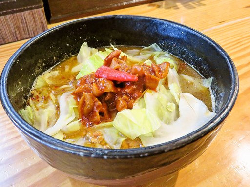 味噌味ふくよかに感じられるスープに、主役の激辛ホルモンの辛味と味わい徐々に交わる一杯!