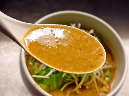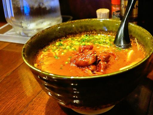 ホルモンの辛さ受け止める、クセを抑えた厚めの煮干しの旨味舌に染みこむスープ!