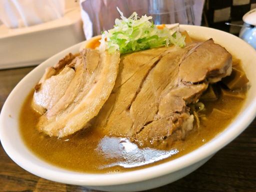 濃い味スープ染みた、コシのある極太麺がいいね!炙ロース&トロ煮バラ肉もたっぷり。