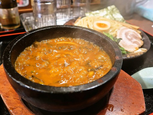 ラーメンより熱いグツグツつけダレ!辛さはちょい辛、そしていつも通りの豚骨もエビも濃厚味~。