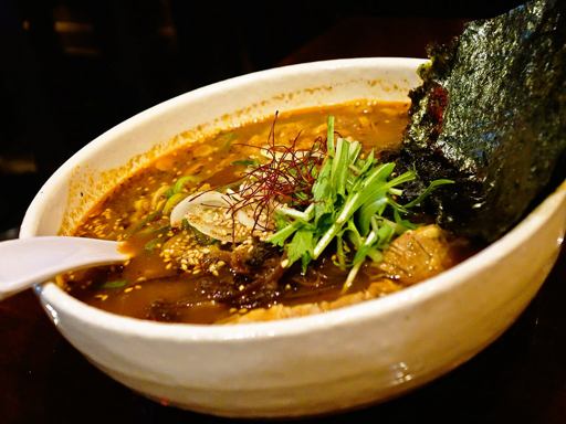 多めのラー油と青花椒の辛さと痺れをしっかり受け止める、コクあるスープとトッピング!