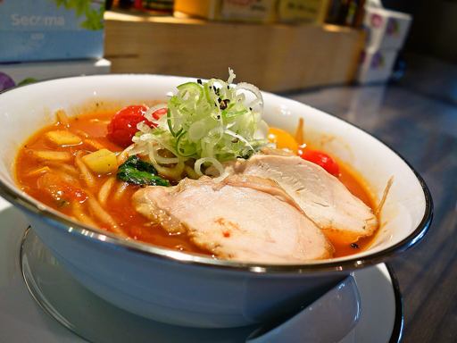 濃厚豚骨&トマト交わるサッパリスープ、パスタ向け小麦の麺、手間の掛かった多種類の具材!