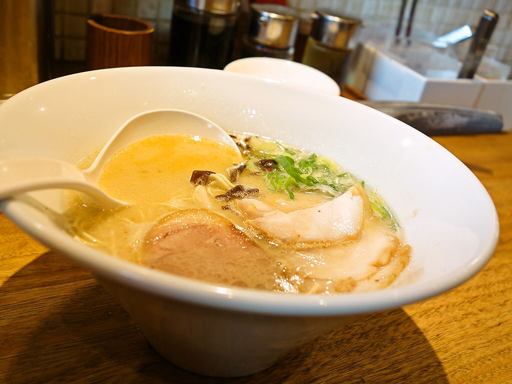 コク強くも重くないクリーミーな豚骨主体の白湯スープに、ふわり柔らかい背脂と魚粉の旨み!