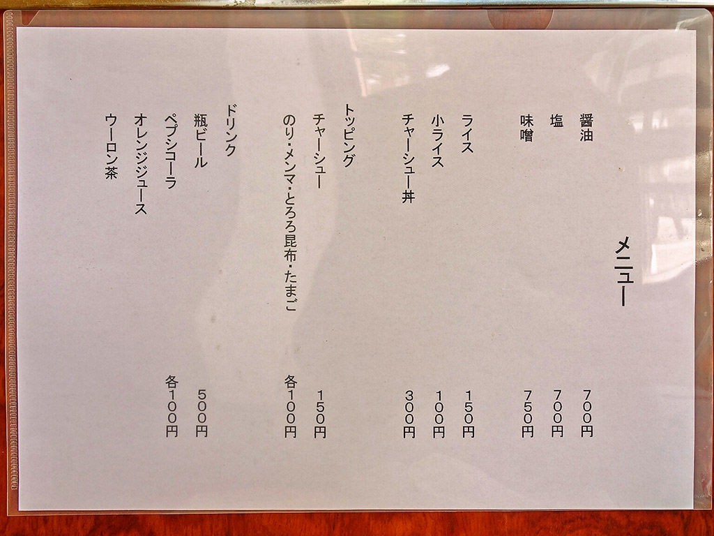メニューはシンプルに醤油・塩・味噌の三味に、あとはチャーシュー丼やトッピングのみ。