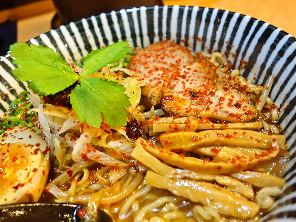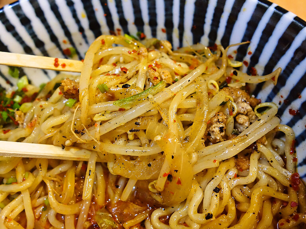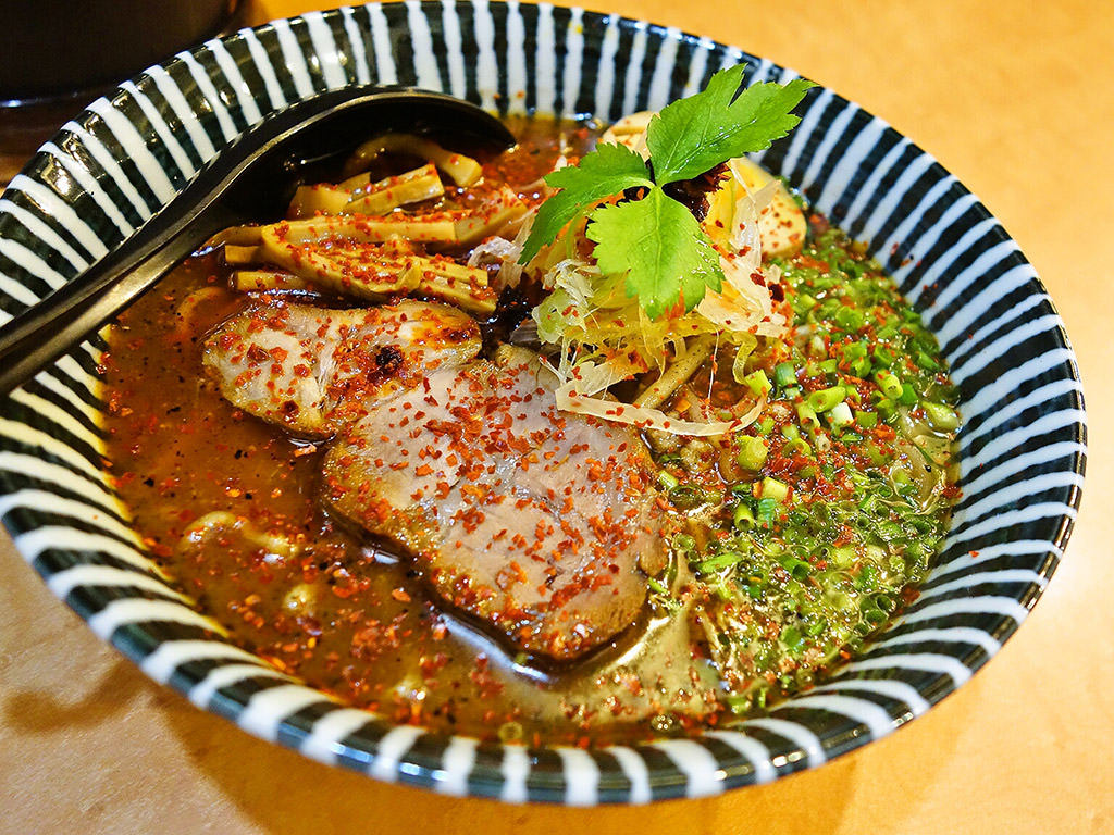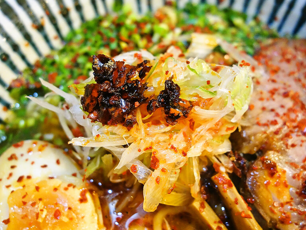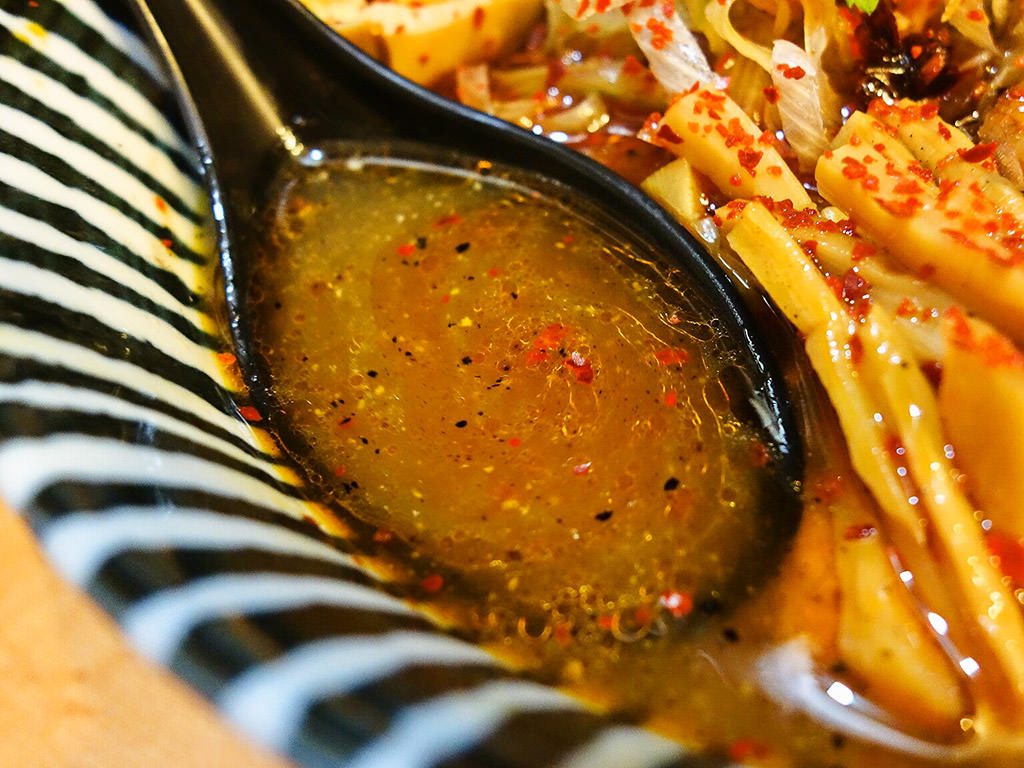 唐辛子がたっぷりふりかかっていますが、辛さは最初おだやか、徐々にじわじわ増えていく感じ。