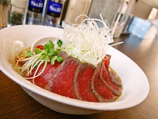キリッと立った白醤油の冷たいスープは暑い日に体に染みる~!たっぷり牛タタキ肉もnice!