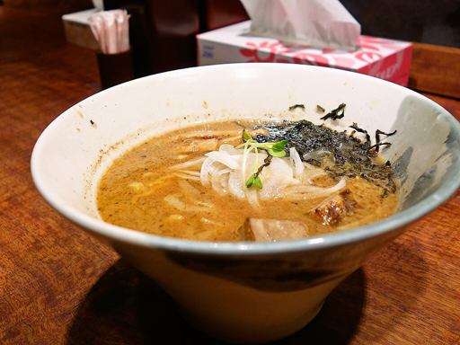 強めに落ち着く味噌ダレの味わいに、豚骨出汁と甘口のAWAが交わる個性的な一杯!