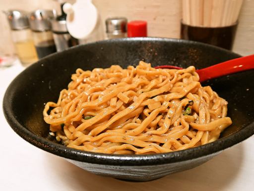 ほんのりビターでシャープで円い味わいに、麺の食感しっかり楽しめるタレの質感も嬉しい極太汁無し!