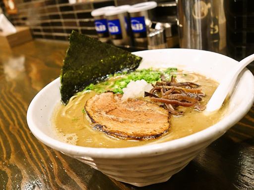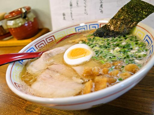 始めはガツンと海老、後半は濃い味の豚骨醤油。7月より「煮干醤油らーめん&つけ麺」に交代!