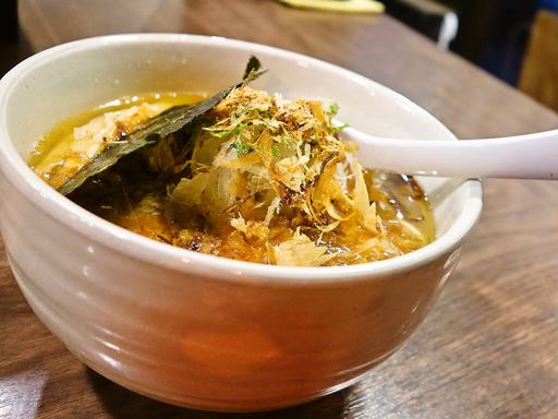 スープ、油、振りかかった節と、サバ尽くしの旨い一杯!醤油味Ver提供中ですが24日まで!