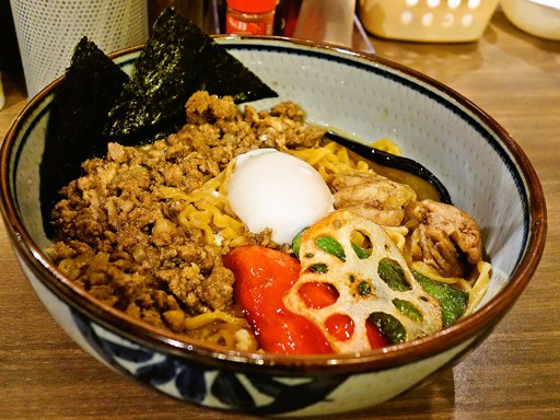 琴似らっきょとのコラボ麺。パンチ抑えめな味噌味スープに、スパイシーなキーマ混ぜて頂く一杯。