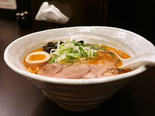 黒色の深い醤油味ありつつ、実は円く優しい味わいのスープに、激辛ホルモンの辛味馴染ませる一品!