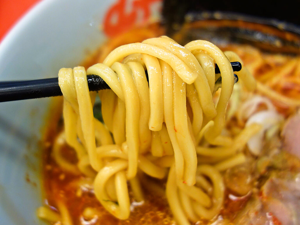 そして山岡家さんならではの、ムッチリムニッっとした太めストレート麺が、